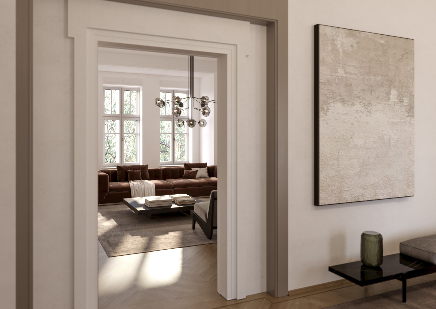 Schon beim Eintreten entfaltet sich eine Atmosphäre aus Ruhe, Geborgenheit und vollendeter Exklusivität. Die Wohnungen der Siegfriedstraße 8 sind mehr als ein Ort zum Wohnen – sie sind Ausdruck eines Lebensstils, der das Besondere im Subtilen sucht.